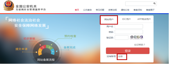 登陸網(wǎng)頁(yè)http://www.beian.gov.cn ,進(jìn)入全國(guó)公安機(jī)關(guān)互聯(lián)網(wǎng)絡(luò)安全管理服務(wù)平臺(tái),點(diǎn)擊“網(wǎng)站用戶登錄”,在點(diǎn)擊下面“注冊(cè)” ,跳轉(zhuǎn)到注冊(cè)頁(yè)面。 輸入正確的用戶名、密碼、郵箱、手機(jī)號(hào)、驗(yàn)證碼和手機(jī)驗(yàn)證碼后,點(diǎn)擊注冊(cè)。注冊(cè)完成跳轉(zhuǎn)到登陸頁(yè)面。