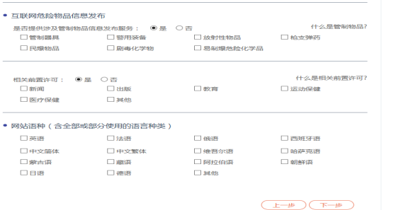 注: 您的網(wǎng)站在不涉及前置審批,請(qǐng)不要在選項(xiàng)內(nèi)容中打勾;如果沒(méi)有您的網(wǎng)站服務(wù)內(nèi)容,就無(wú)需選擇。