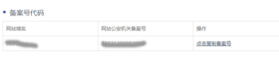 在完成以上審核以后,公安機(jī)關(guān)將會(huì)發(fā)放公安部備案號(hào),您需要將備案號(hào)放置網(wǎng)站首頁(yè)下端 ;您可以將網(wǎng)站備案代碼放置在網(wǎng)站上,獲取代碼方法:在已備案網(wǎng)站中查看網(wǎng)站詳情,點(diǎn)擊【點(diǎn)擊復(fù)制備案號(hào)】即可獲得備案代碼。
