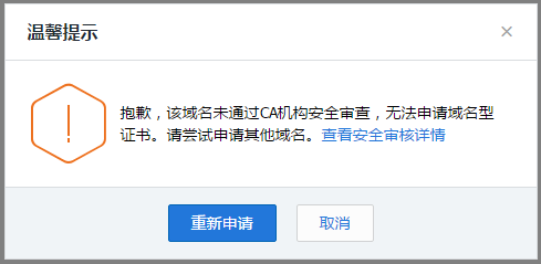 申請域名型(DV)SSL證書時,出現如下提示,說明申請域名的安全審核失敗,賽門鐵克CA機構的快速審核流程不支持對該域名頒發域名型SSL證書,請購買付費證書。