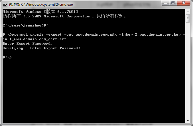2.3 打開命令行程序cmd(以管理員身份運行),進入2_www.domain.com.key、1_www.domain.com_cert.crt所在目錄,運行以下命令