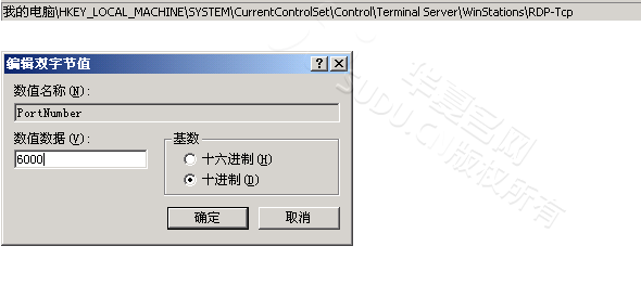 PortNumber值,默認是3389,選擇十進制,改成你所希望的端口(范圍在1024到65535,而且不能沖突),比如6000,見下圖: